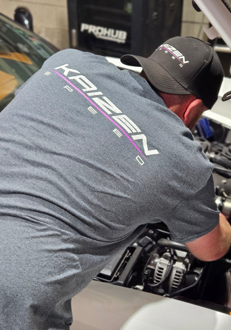 Our latest shirt design printed on dark Heather Grey Gildan Dry Blend t-shirts by our friends at Rad Ragz LLC.  Featuring the new Kaizenspeed logo on the front and back along with several of our preferred industry partner's logos on the sleeves.  Snag yours today!